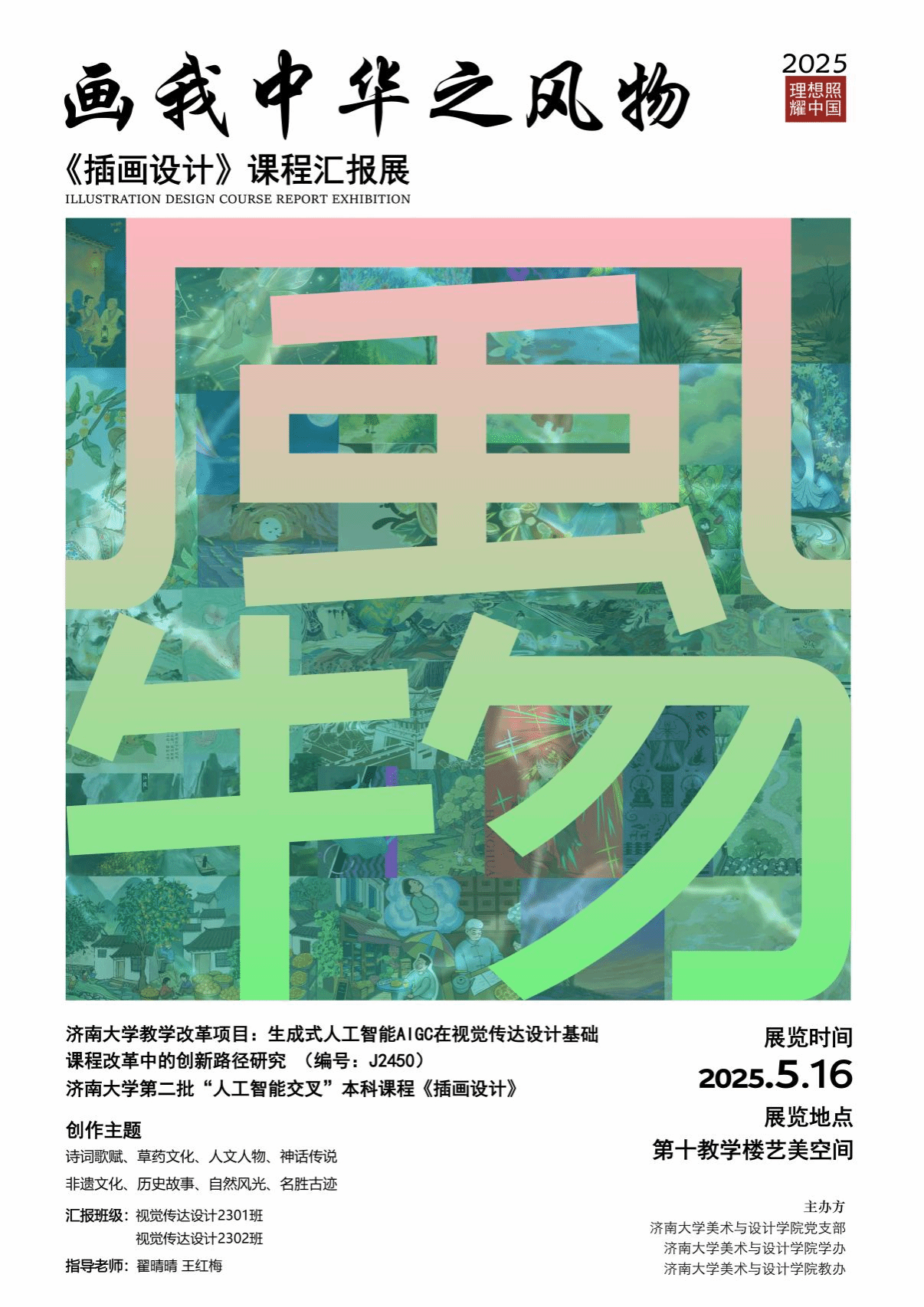 本次展览共展出2023级视传专业的同学60余件作品,内容以诗词歌赋、草药文化、神话传说、非遗文化、历史故事等为主题,借助人工智能辅助创作,呈现了一系列风格多样、内涵丰富的插画作品。济南大学长期以来坚持将美育融入人才培养全过程,通过课程体系建设、实践活动开展和校园文化营造,不断提升学生审美素养与人文情怀,为此次创作注入源源不断的灵感与艺术生命力。