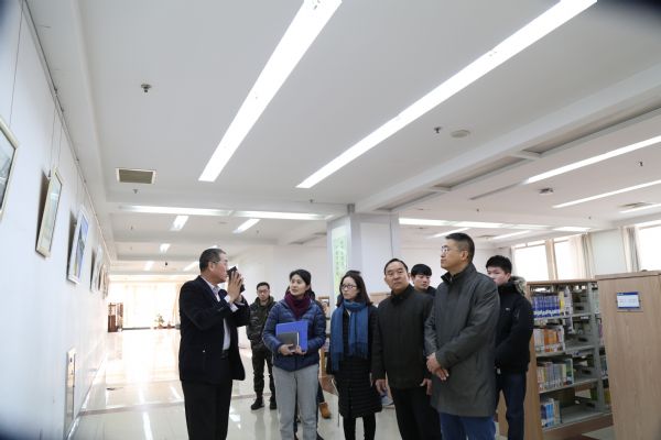 在高书记的带领下,领导、老师和同学们一起参观了在图书馆阅览室展出的往届“手绘济大”优秀作品。